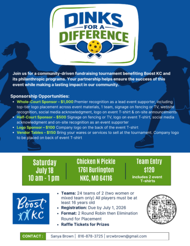 Join us for Dinks for a Difference, a community-driven pickleball tournament benefiting Boost KC and its philanthropic programs. This exciting event brings together players, supporters, and local partners for a fun day of competition, connection, and giving back. Your participation and partnership help ensure the success of the tournament while making a meaningful and lasting impact in our community.